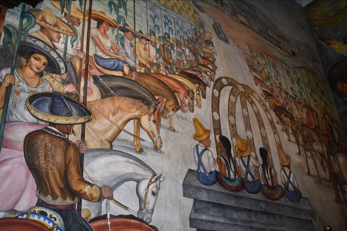 Painted by the artist Roberto Cueva del Río, who began work on the mural in 1931, the sweeping series depicts various scenes floor-to-ceiling scenes - the Tehuantepec Festival of the Flowers; a rural scene from Ixtaccihuatl and Popocatepetl, scenes of industrial Mexico, the landing of Columbus and pre-Columbian Mexico and others.